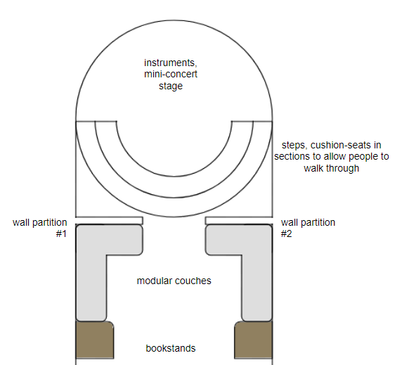 In the far end of the hall, the floor depresses a couple of steps to create a simple stage, where stand a number of instruments—an upright grand piano, a couple acoustic guitars, a simple scale of kettledrums, and one(1) ukelele. The walls here round out to create a bulbous tip which, along with the ceiling's height and acoustical panels, create a sort of miniature concert stage. Cushions line on the steps in sections for audience member comfort, should they wish to listen to the performance up-close and personal.